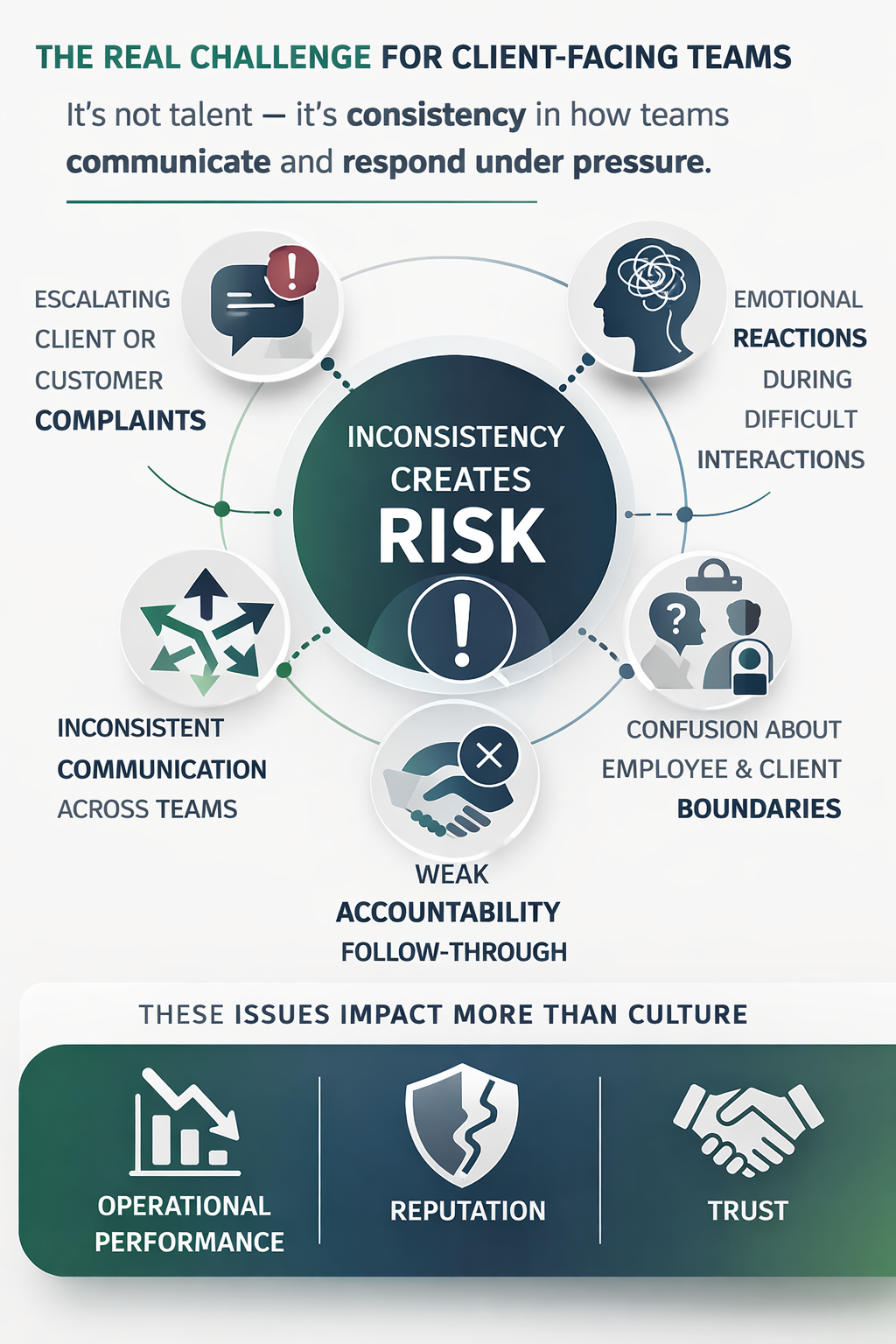 We serve organizations where professional communication, accountability, and client interactions directly impact operational performance and the quality of the client experience.