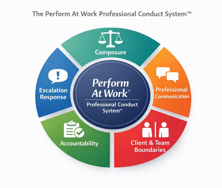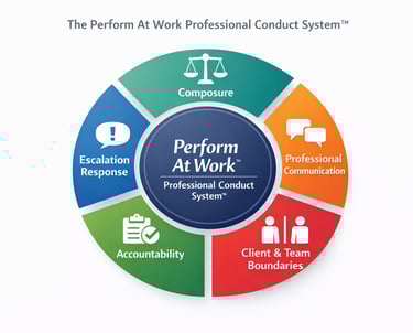 The Perform At Work Professional Conduct System™ was developed to address those challenges through a structured, practical framework that organizations can implement to strengthen professional standards and improve performance.